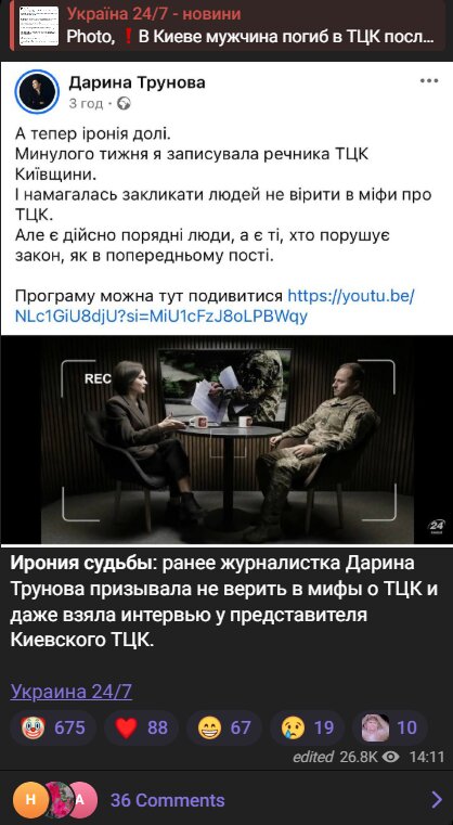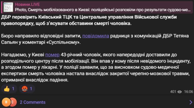Крім цього, у мережі з'явилися відомості про сумний випадок мобілізованого до ТЦК і журналісти офіційно про це написали у мережах.