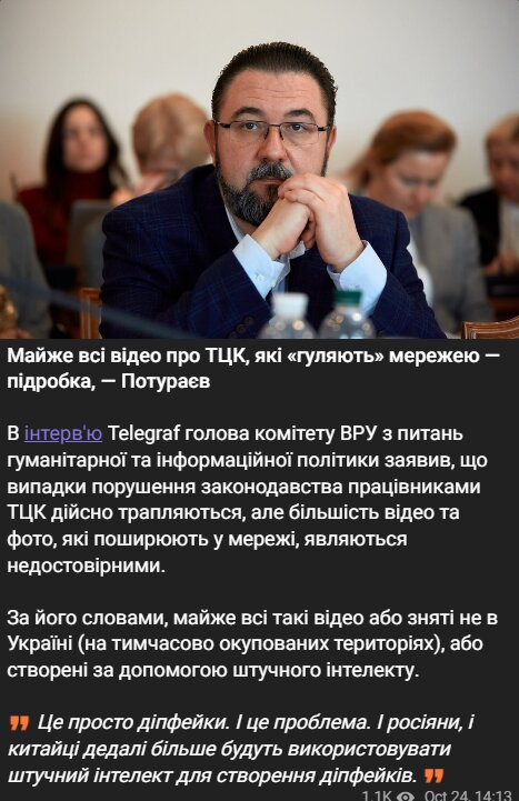 Голова Комітету Верховної Ради з питань гуманітарної та інформаційної політики Микита Потураєв заявив, що хоча окремі випадки неправомірних дій співробітників ТЦК мають місце, більшість матеріалів, що поширюються в інтернеті, не є справжніми.
