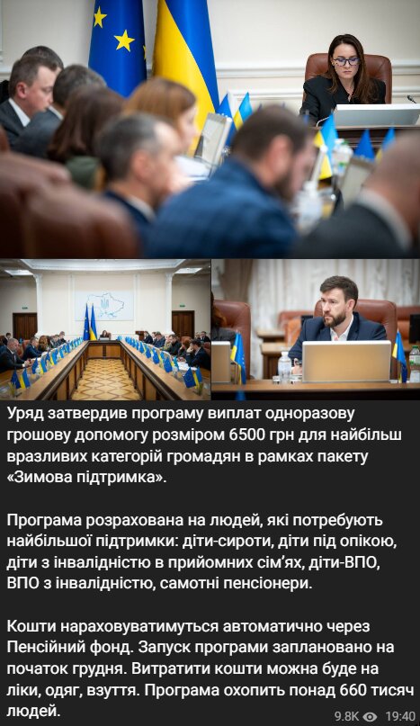 У рамках ініціативи «Зимова підтримка» Кабінет Міністрів затвердив одноразову виплату у розмірі 6500 гривень для громадян, які найбільше потребують державного захисту.