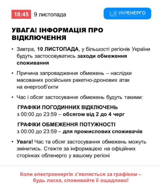 Ці заходи запроваджуються у зв'язку зі збитками, завданими масштабними російськими ракетними та безпілотними ударами по енергетичній інфраструктурі країни.