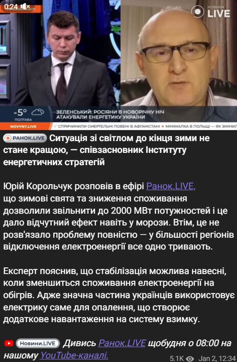 На думку Юрія Корольчука, співзасновника Інституту енергетичних стратегій, суттєвого покращення ситуації з електропостачанням в Україні до кінця зими є малоймовірним.