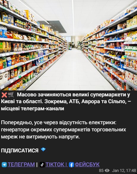 Поки електропостачання залишається нестабільним, подальші тимчасові закриття супермаркетів можуть статися не лише у Києві, а й в інших регіонах країни.
