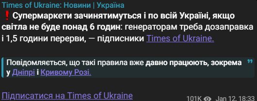 Аналогічні правила роботи вже деякий час діють в інших українських містах, включаючи Дніпро та Кривий Ріг, де тривалі відключення світла вже стали регулярною проблемою для роздрібних підприємств.