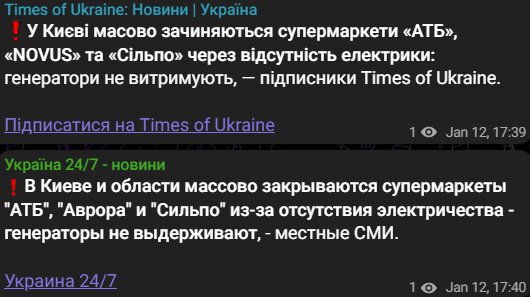 За повідомленнями мешканців та місцевих джерел, супермаркети великих мереж, таких як АТБ, «Сільпо», «Аврора» та «Новус», припиняють роботу у різних районах столиці. Покупці бачать зачинені двері та оголошення про те, що магазини не працюють.