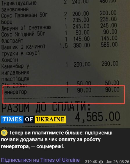 На тлі відключень світла українські споживачі все частіше помічають у своїх чеках додатковий рядок — окрему плату за електроенергію, що виробляється резервними генераторами. Повідомлення про такі надбавки швидко поширюються у соціальних мережах.