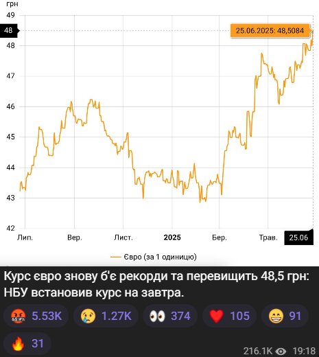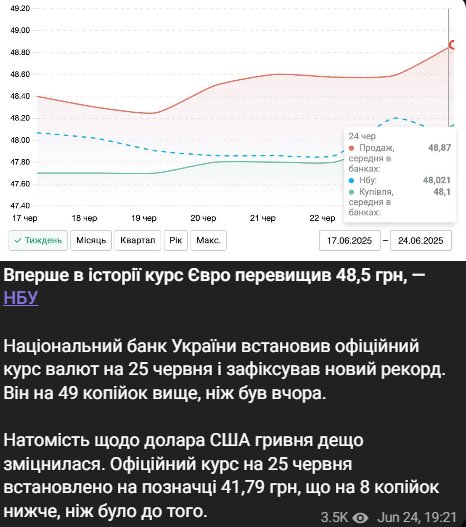 Национальный банк Украины (НБУ) объявил официальные курсы валют на вторник, 25 июня, что стало исторической вехой на валютном рынке страны. Впервые за всю историю евро преодолел порог в 48,5 гривен, установив новый исторический максимум.