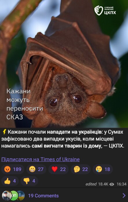 Органы здравоохранения Сумской области призывают жителей сохранять бдительность после того, как два человека были укушены летучими мышами в разных случаях, сообщает Областной центр по контролю и профилактике заболеваний.