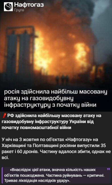 В ночь на 3 октября Россия осуществила самый масштабный удар по газодобывающей инфраструктуре Украины с начала полномасштабного вторжения.