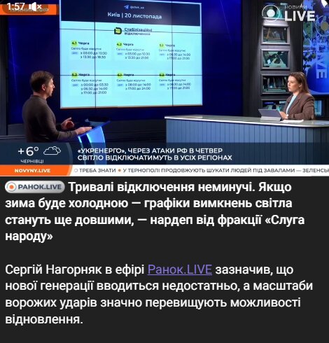 Ожидается, что длительные отключения света продолжатся, а особенно холодная зима может привести к ещё более длительным перебоям, согласно оценкам нардепа от фракции «Слуга народа» Сергея Нагорняка.