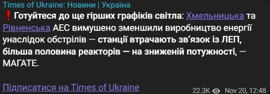 Но это еще не все, так как проблемы с электрогенерацией усугубляются эксплуатационными трудностями на ключевых ядерных объектах. Хмельницкая и Ровенская АЭС были вынуждены снизить выработку из-за повреждений и перебоев в работе линий электропередачи.