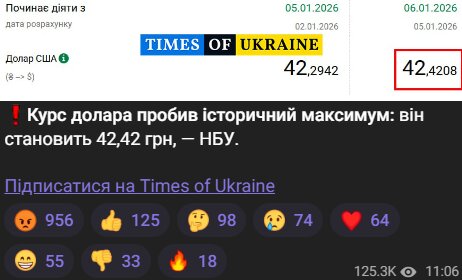 По состоянию на 6 января 2026 года Национальный банк Украины установил новый официальный курс доллара США на уровне 42,42 гривны. Эта цифра является самым высоким уровнем в истории национальной валюты Украины, превзойдя все предыдущие рекорды.