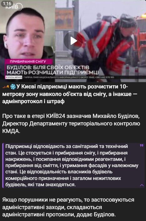 В Киеве владельцы предприятий обязаны убирать снег в пределах 10-метровой зоны вокруг своих помещений. Несоблюдение этого требования может повлечь за собой административную ответственность и штрафы, как сообщает Михаил Будилов, директор Департамента территориального контроля КГГА.