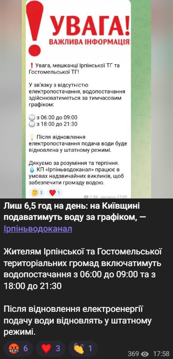 По данным Ирпинводоканала, жители Ирпинской и Гостомельской территориальных общин будут получать воду в течение ограниченного количества часов в сутки.