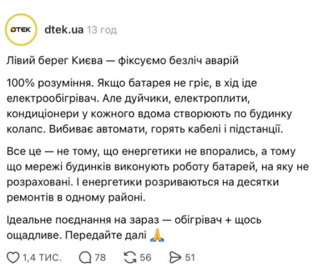По информации энергетической компании, после восстановления электроснабжения происходит резкий скачок потребления, поскольку многие жители одновременно включают электрические обогреватели. Это создает дополнительную перегрузку сетей, уже ослабленных атаками, что приводит к повторным отключениям света и замедляет ремонтные работы.