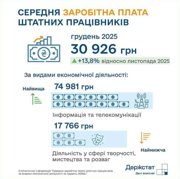 Согласно данным Государственной статистической службы, средняя месячная заработная плата в Украине на конец 2025 года выросла до 30 926 гривен, что почти на 14% больше, чем в предыдущем году.