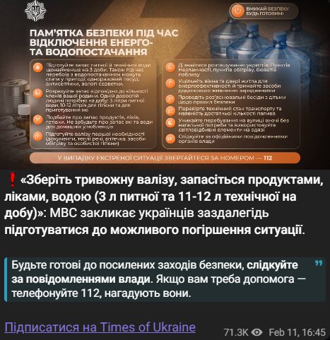 Киевская городская государственная администрация также призвала жителей проверить свои запасы воды и пополнить их при необходимости, как для питьевых, так и для бытовых нужд.
