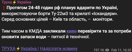 Некоторые мониторинговые каналы сообщают, что в течение следующих 24-48 часов удары могут быть нанесены самолетами Ту-22М3 и крылатыми ракетами «Искандер», при этом Киев и регион указаны в числе возможных целей.