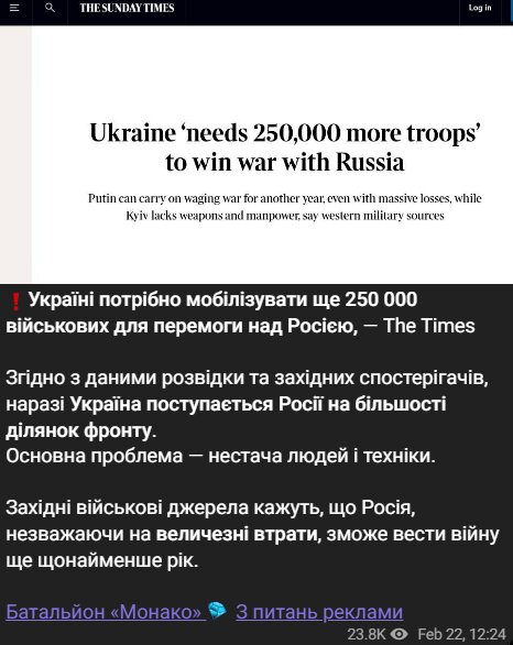 Очень популярная зарубежная газета «The Times» сообщает, что Украине потребуется мобилизовать дополнительно 250 000 военнослужащих, чтобы вернуть инициативу на поле боя и более эффективно противостоять российским силам.
